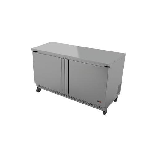 Worktop Freezer, 60″ wide, two-section, 15.0 cu.ft., (2) doors, (4) adjustable epoxy coated wire shelves, front breathing self-contained refrigeration, 4″ castors front 2 with brakes, stainless steel interior & exterior, 4″ fixed coved corner backsplash, 3/4 hp, cETL, UL, NSF 7, Made in North AmericaFagor Refrigeration